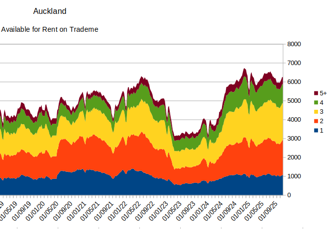 This winter high of rentals in Auckland peaked below last years high at 6550 in July. There was a slightly steeper decline in numbers to a season low of 5990 by September 23rd. This was below the level of September 20024... but only just. Since then things have been quite stable and do not look like getting up to the November 2024 supply peak of 6722 rentals available. But all we can really have some confidence is that the worst for landlords is probably over. However, that not to say that the rental market will get much easier for landlords anytime soon.